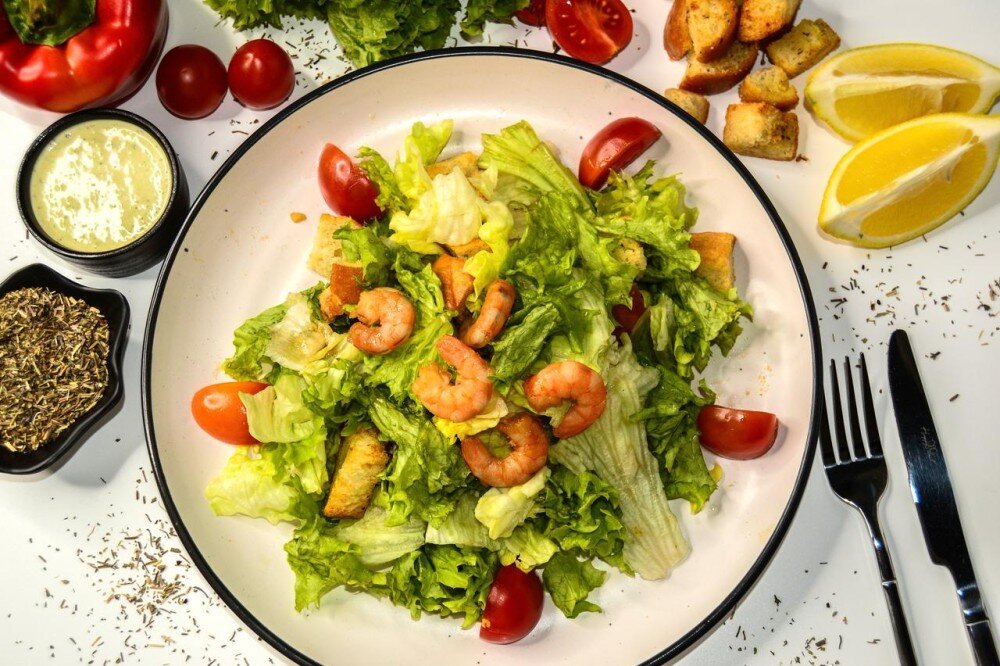 Креветки королевские, лист салата, айсберг, черри, гренки, сыр, заправка