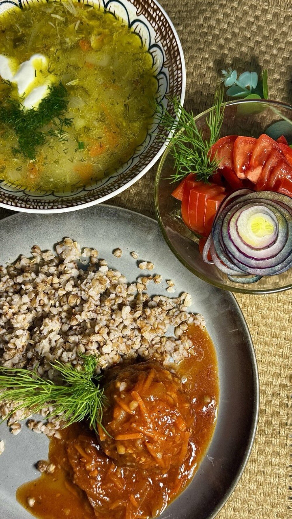 Салат овощной с горчичным маслом / Рассольник / Тефтеля с гречкой