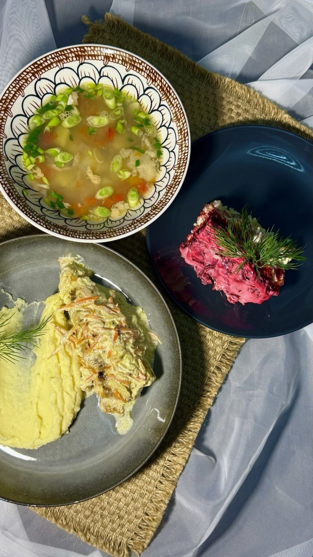 Салат Сельдь под шубой / Уха из сома / Минтай жареный с овощами и картофельным пюре