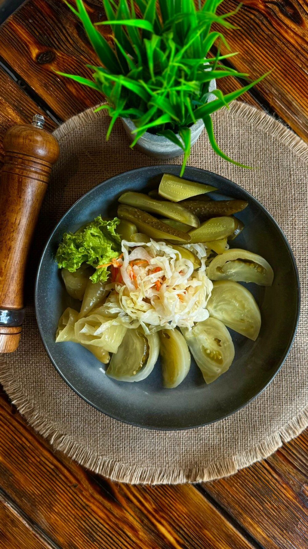 Огурчик бочковой, помидор бочковой, капуста квашенная, перец острый