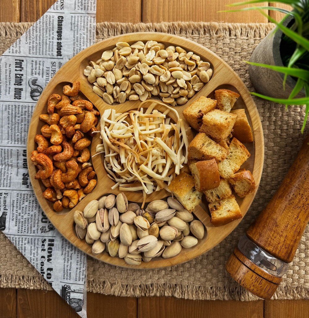 Фисташки, арахис солёный, кешью в специях, гренки белые с чесноком, сыр косичка
