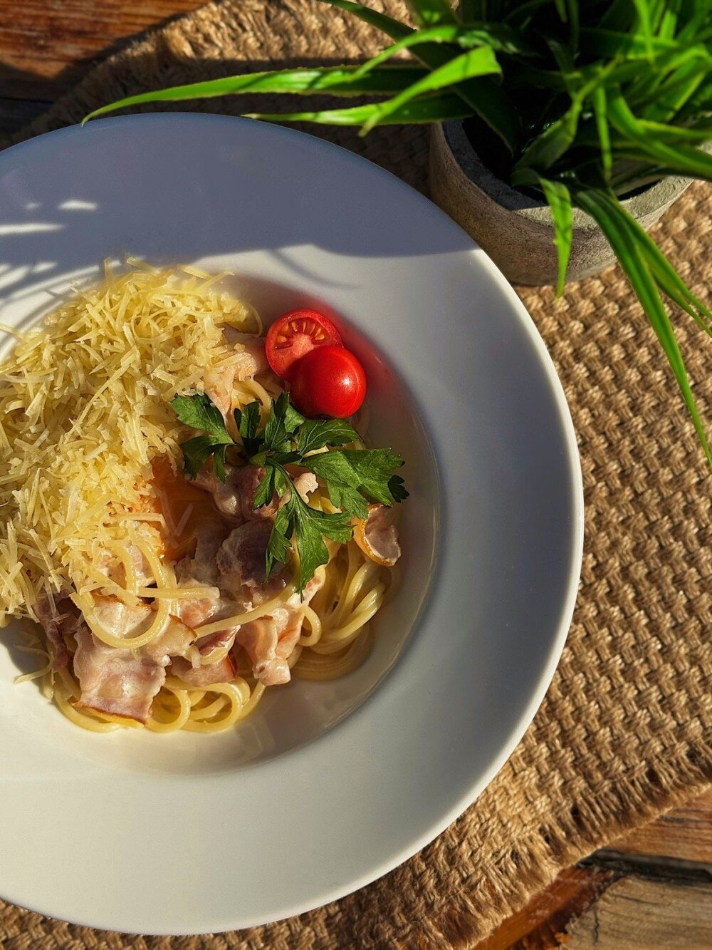 спагетти, бекон, пармезан, яйцо, черри, сливки