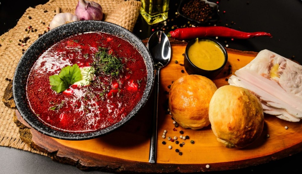 подаётся с гренками, салом, горчицей, зелёный лук и чеснок